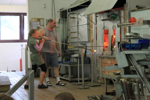 Nathalie bläst ihr eigene Glaskugel in einer Glasbläserei